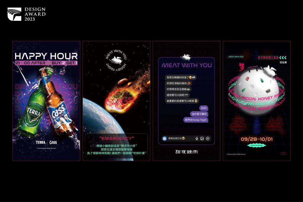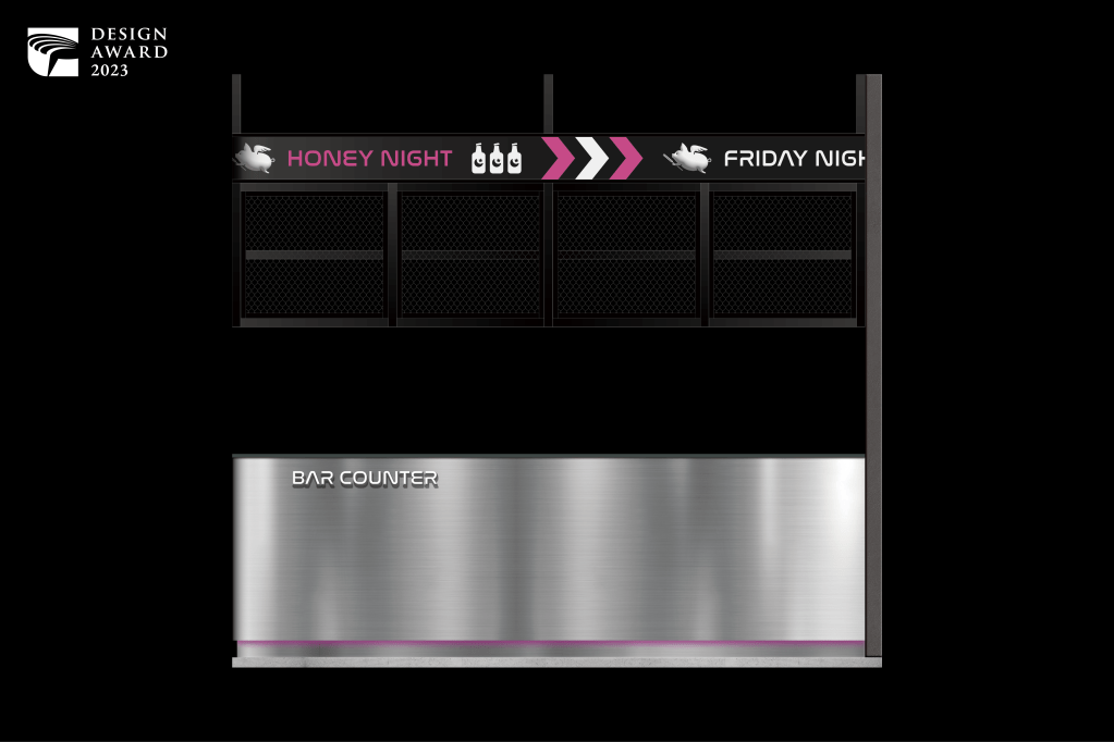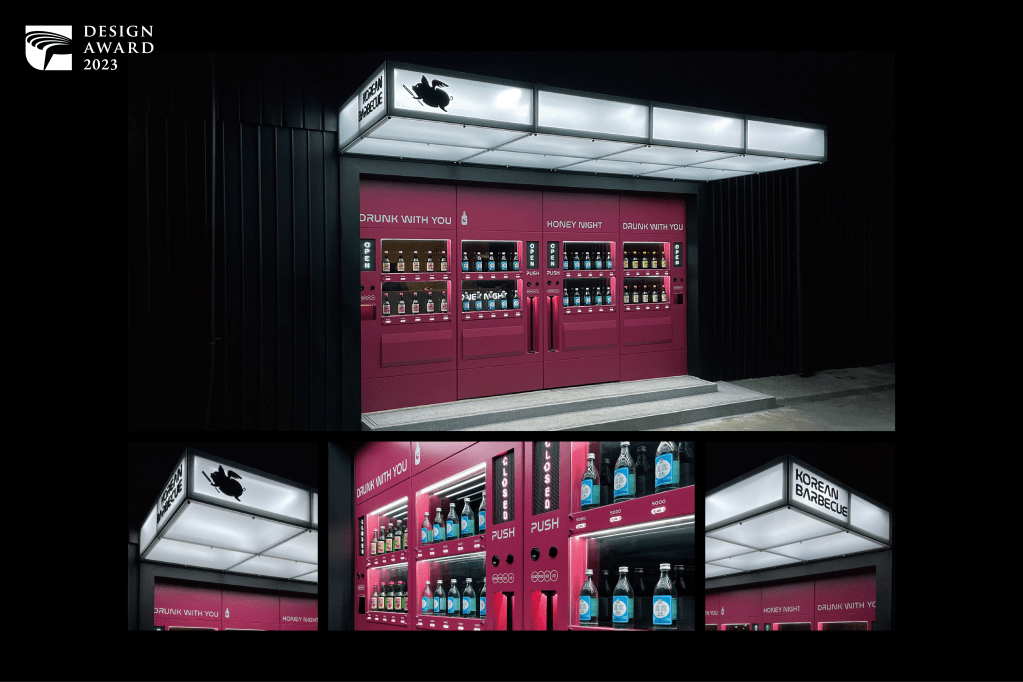 Honey Night as if in a nightclub or bar in Korean style. Life is about flying to happiness is the branding value (Brand Logo: Fly Pig). The designer’s concept as the interaction for consumers keeps on the minimalist style and creates the march to a different tune for the Honey Night brand visual. Lead us into the authentic nightlife style of Korean culture. Vending Machine: The vending machine themed facade incorporates a well-defined theme, captivating visual effects, and practicality, making use of a variety of unique materials and techniques. With its striking visual theme, it allows people to easily grasp the characteristics and distinctive features of the establishment, eliminating the need for textual explanations. This design not only focuses on a singular aspect but has been meticulously developed from the overarching concept down to the tiniest details. The indoor and outdoor elements harmonize with one another, as the lighting and ambiance create a unified atmosphere. The decorations on the tables and the attire of the staff members are closely aligned with the same theme, encompassing graphic design, product planning, and even interactive devices. The entire project can be regarded as a comprehensive design that meticulously considers every aspect, from the macro to the micro.