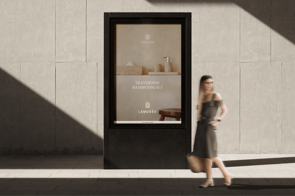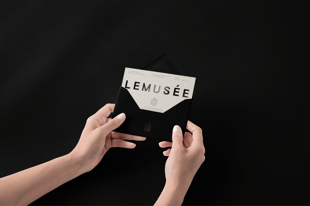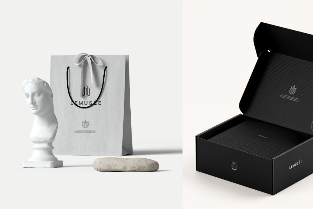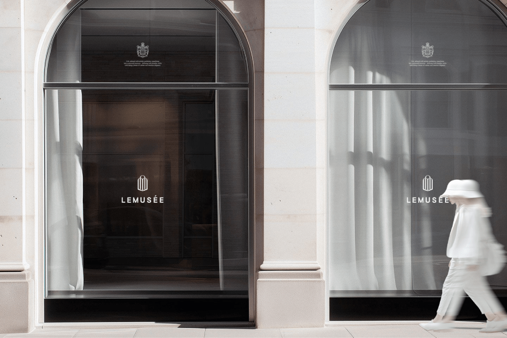 A bespoke typeface was created for LEMUSÉE, capturing the very essence of elegance. Designed with refined precision, the typography harmonizes with the structural aesthetics of the brandʼs emblem, cultivating an innate atmosphere of artistry.